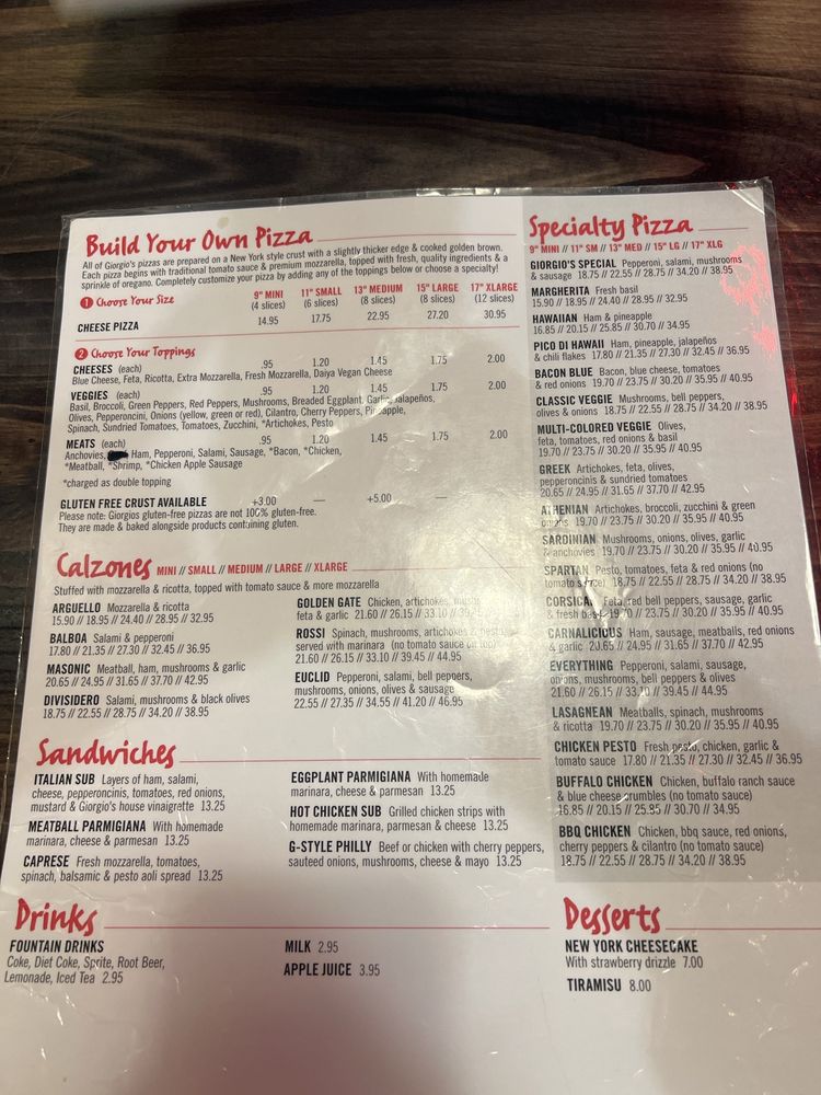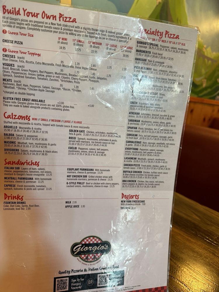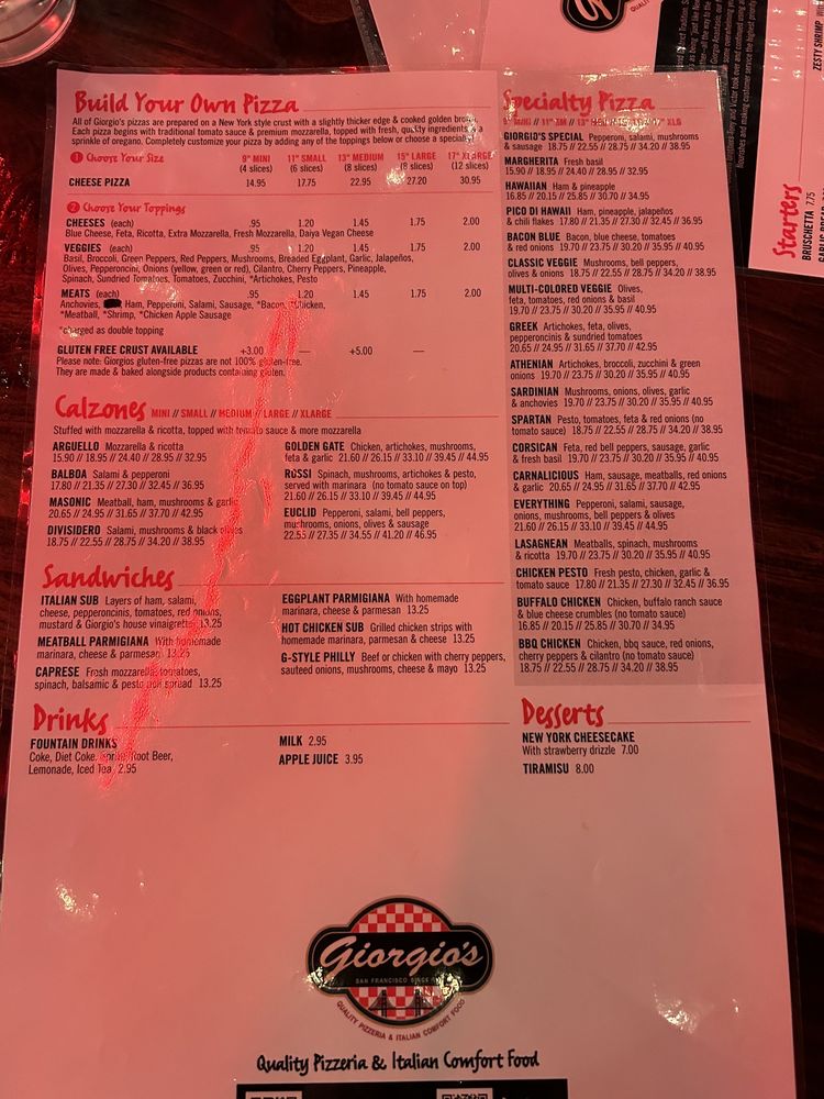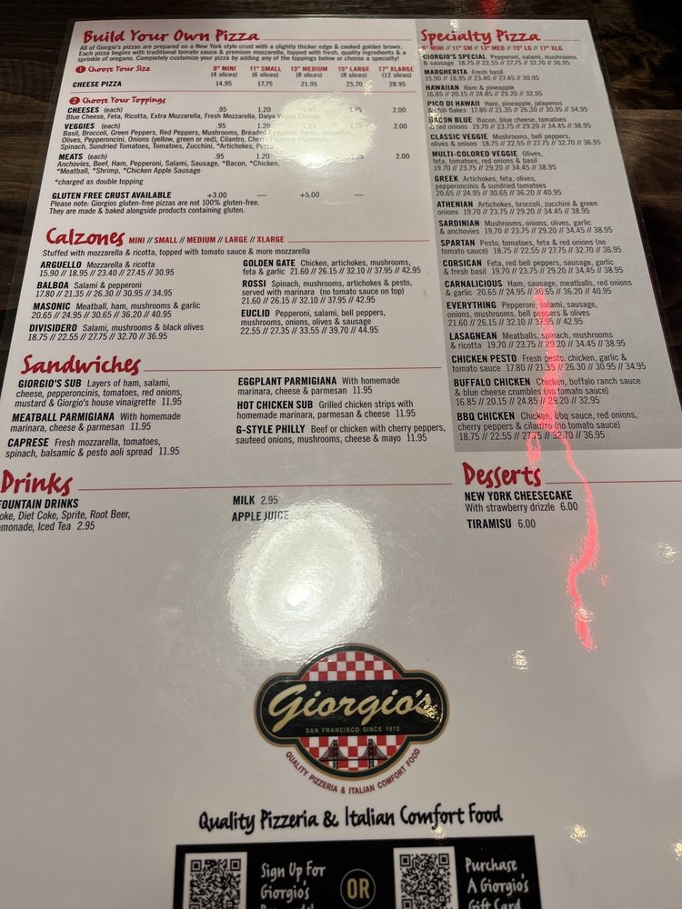 Giorgio’s Pizzeria in San Francisco offers a taste of Italy with its delicious pizzas and pasta dishes. Customers rave about the authentic flavors that remind them of Italian cuisine. The menu boasts a variety of options, from traditional NY style pizzas to custom calzones, all wrapped in a friendly Italian family vibe. The thin, crispy crust pizzas with gooey cheese are a standout, especially when paired with toppings like chicken pesto. The spaghetti and meatballs and spicy penne are also highly recommended for pasta lovers. With a welcoming atmosphere, excellent service, and options for vegan and vegetarian diners, Giorgio’s is a go-to spot for a satisfying meal. Whether you're a pizza connoisseur or pasta enthusiast, Giorgio’s Pizzeria will leave you craving more.